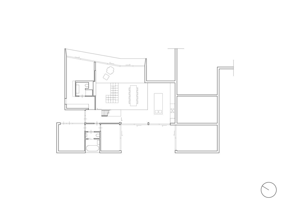 The 1970s bungalow was extended to create extra space, with a large window and open decking designed to maximize views over paddocks and farmland to the west. To the east of the bungalow, large sliding doors and windows were introduced to connect and integrate the living areas with a large garden.